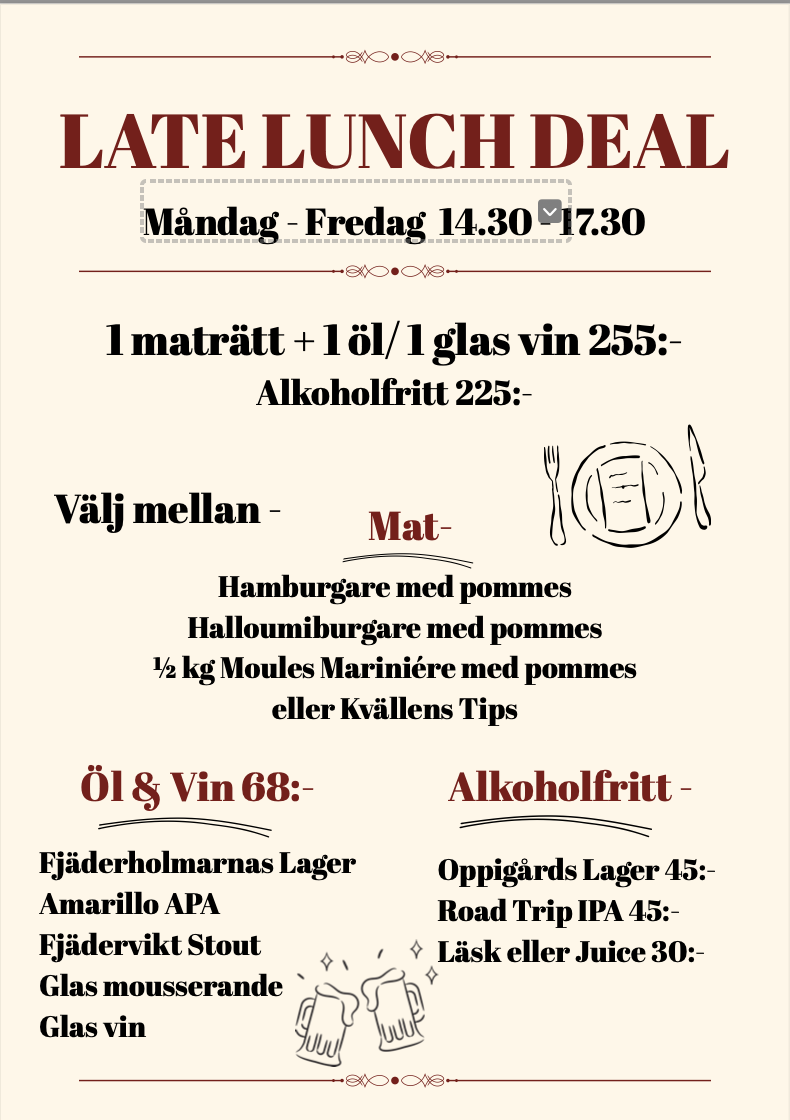 Måndag – fredag klockan 11.00-14.30. I lunchen ingår vatten/bubbelvatten, bröd, salladsbuffé & kaffe/te